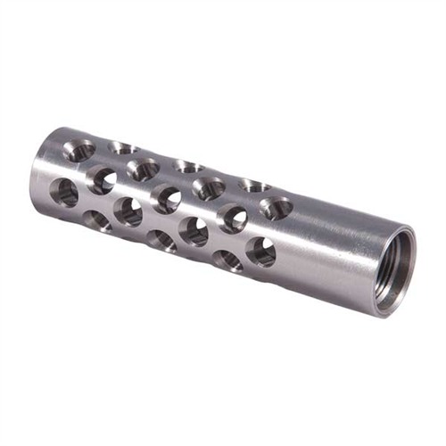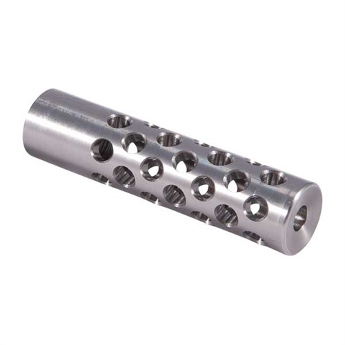 Der Multi-Port-Bremsmechanismus mindert das gefühlte Rückstossgefühl und reduziert das Hochsteigen des Mündungsfeuers. Eine einzelne Erweiterungskammer und insgesamt 42 Ports, 21 auf jeder Seite, in einem Winkel von 7° nach vorne, bieten maximalen Rückstosskontrolle. Gunsmithing erforderlich. Kommt mit einem Ausgangsloch von .220" (nominal), das auf .020" grösser als der Geschossdurchmesser geöffnet werden muss. Kann vergrössert werden, um Geschosse bis zu .44 Kaliber zuzulassen. Die hintere Aussenfläche des Kompensators kann bearbeitet werden, um sich an den Lauf anzupassen.