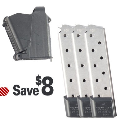 Magazine -Built to the very highest standards for the no-fail performance competitive and self-defense shooters demand. Feed lips are roll-formed and polished, not die cut, for added strength, and Chip’s proprietary follower design provides flawless feeding with semi-wadcutters and hollow points. Powerful spring of proprietary, heat-treated Rocket Wire further ensures reliable feeding, even when left fully loaded and seated in a pistol for extended periods. Removable plastic base pad with full, front-to-back engagement, is built to withstand continual use, and numbered witness holes on both sides of the body provide a fast, visible round count. Available in 8-round capacity with slightly extended base pad that adds about ¼" to magazine length. Magazine Loader - Hand-held loader fills pistol magazines quickly and easily, so you spend less range time loading mags and more of it shooting. Smooth, positive operation protects fingers and thumbs while you load hundreds of rounds painlessly—as fast as one round per second. Also lengthens magazine life by reducing wear and tear on feed lips. Hold the magazine upright with the bottom resting on a solid surface. Place the loader over the top of the mag, press down lightly while squeezing the lever to depress the follower, drop in a round, and work the lever quickly to push it into the mag. Repeat the process until the magazine is full. Constructed from tough, reinforced, black polymer. Locks closed when not in use, so it takes up minimal space in pocket or range bag. UpLula fits single- and double-stack 9mm, .357 SIG, .40 S&W, 10mm, and .45 ACP magazines, plus some .380 mags. Will not load Glock 6-round single-stack .45 caliber, Smith & Wesson 7-round single-stack 9mm, or magazines with less than 8mm between feed lips.
