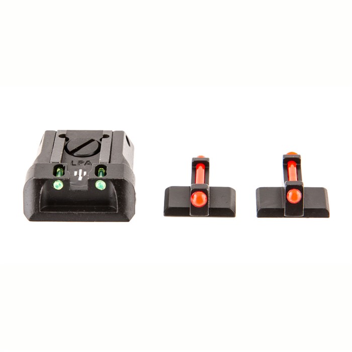 Fusion Firearms / LPA Voll einstellbares Dovetail-Visier-Set in Fiber Optic-Konfiguration. Dieses Hintervisier ist im "Low Profile"-Design gestaltet, was das Verstauen erleichtert und es zu einem grossartigen Ziel-, Kampf- oder Versteckvisier macht. Es ist ein hervorragendes Ersatzvisier, mit dem du den "Point of Impact" (POI) nach deinen Wünschen feinjustieren kannst. Sie werden mit präzise bearbeiteten Komponenten für feine und positive Klickanpassungen hergestellt und sind vollständig für Wind- und Höhenverstellung einstellbar. Die Dovetail-Hintervisier-Basen haben Verriegelungsschrauben, die eine sichere Befestigung im Schlitten-Dovetail ermöglichen. Das Dovetail-Hintervisier hat die Standardgrösse .495 x 65 Grad und das vordere Dovetail hat die Standardgrösse .330 x 65 Grad. Diese Visier sind in Schwarz, Weisspunkt und Fiber Optic-Konfigurationen erhältlich. Sie sind direkte Ersatzvisiere für die beliebten Novak-Visieröffnungen, die bei den meisten modernen 1911-Stil-Pistolen und vielen anderen verwendet werden. Kommt komplett mit flachem Vorder- und Hintervisier, bereit zur Installation.