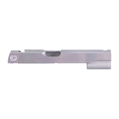 Custom-quality slides from Caspian, ready to be fitted to the frame of your choice. They start as high-quality forgings for extra strength, then are heat-treated to Rc 38-41 before machining for exceptional dimensional stability. Sides are polished, while the rest of the surface is bead-blasted for a non-glare, matte finish. Deep-cut, forward-angled rear cocking serrations prevent slippage when racking, even with a wet hand. Available in 4340 carbon steel (CS) and 416 stainless steel (SS) with .45 ACP, .40 S&W, and 9mm breechfaces. Commander and Officers models in .45 ACP only. Choose a slide without sight cuts (NC), or between two pre-cut dovetail options: a Novak Lo-Mount or Bo-Mar BMCS rear cut, both coupled with a Novak front cut. Recon slide is a Government slide with ball cuts at the front that line up with the light rail on the Caspian Recon frame (available separately). All slides require the use of a 9mm/.38 Super firing pin.