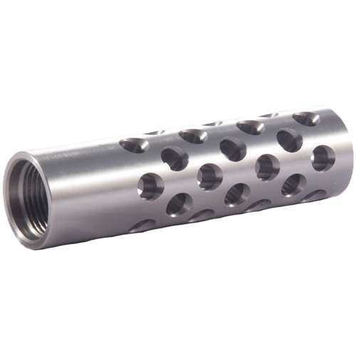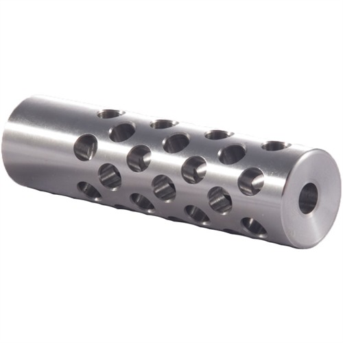 Multi-port brake softens felt recoil and reduces muzzle rise. A single expansion chamber and 42 total ports, 21 on each side, angled 7° forward, provide maximum recoil control. Gunsmithing required. Comes with a .220" (nominal) diameter exit hole that must be opened up to .020" larger than bullet diameter. Can be enlarged to allow bullets up to .44 caliber. Rear exterior of comp can be machined to conform to barrel.