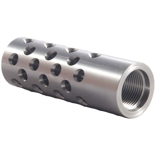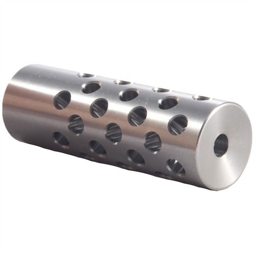 Multi-port brake softens felt recoil and reduces muzzle rise. A single expansion chamber and 42 total ports, 21 on each side, angled 7° forward, provide maximum recoil control. Gunsmithing required. Comes with a .220" (nominal) diameter exit hole that must be opened up to .020" larger than bullet diameter. Can be enlarged to allow bullets up to .44 caliber. Rear exterior of comp can be machined to conform to barrel.