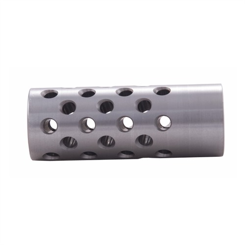 Der Multi-Port Bremsmechanismus mildert den gefühlten Rückstoss und reduziert den Mündungshub. Eine einzelne Expansionskammer und insgesamt 42 Ports, 21 auf jeder Seite, die um 7° nach vorne geneigt sind, bieten maximalen Rückstosskontrolle. Gunsmithing erforderlich. Kommt mit einem .220" (nominal) Durchmesser Austrittsloch, das um .020" grösser als der Geschossdurchmesser geöffnet werden muss. Kann vergrössert werden, um Geschosse bis zu .44 Kaliber zuzulassen. Die hintere Aussenseite der Bremse kann bearbeitet werden, um sich an den Lauf anzupassen.