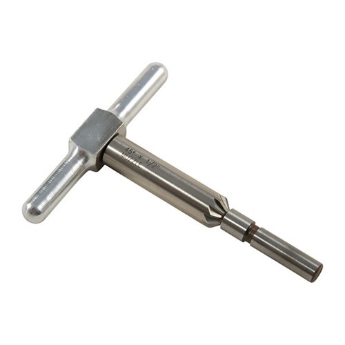 Ce cutter de chanfreinage à 45° brise les arêtes des rayures pour une sortie de balle propre ou chanfreine les bouches de chambre des cylindres de revolver pour des recharges rapides. Le kit comprend le cutter, une poignée et un pilote, le tout dans une boîte en polypropylène. Le pilote interchangeable maintient le cutter bien aligné. N'hésite pas à acheter des pilotes supplémentaires pour utiliser un cutter avec plusieurs calibres différents. Des pilotes pour d'autres calibres sont disponibles séparément.
