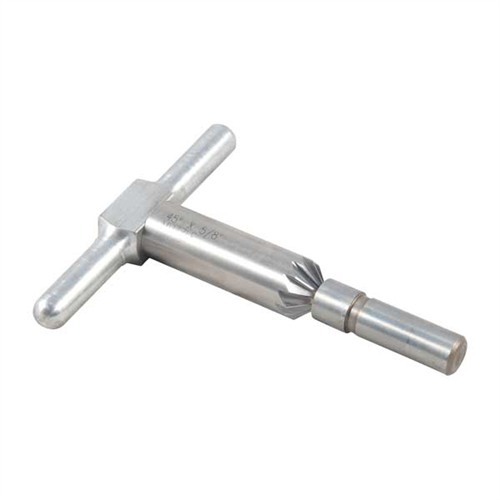 Il cutter di smussatura a 45° rompe i bordi delle rigature per un'uscita pulita del proiettile oppure smussa le bocche delle camere del cilindro del revolver per ricariche rapide. Include il cutter, un manico e un pilota, il tutto in una scatola di polipropilene. Il pilota intercambiabile mantiene il cutter correttamente allineato. Acquista piloti extra per utilizzare un cutter con molti calibri diversi. I piloti per altri calibri sono disponibili separatamente. Il cutter a 45° fornito nei set contrassegnati con un * è di 5/8\" di diametro per smussare correttamente le bocche dei barili e dei cilindri più grandi di quei calibri. Tutti gli altri set hanno un cutter di ½\" di diametro e 45°.