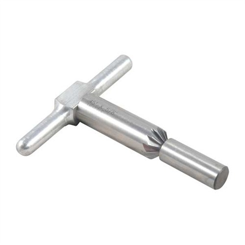 Il cutter da chamfering a 45° rompe i bordi della rigatura per un'uscita pulita del proiettile, oppure affila le bocche delle camere del cilindro del revolver per ricariche rapide. Include il cutter, un manico e un pilota, il tutto in una scatola in polipropilene. Il pilota intercambiabile mantiene il cutter correttamente allineato. È possibile acquistare piloti extra per utilizzare un cutter con molti calibri diversi. I piloti per altri calibri sono disponibili separatamente. Il cutter a 45° fornito nei set contrassegnati con un * ha un diametro di 5/8\" per affilare correttamente le bocche dei cilindri e delle canne più grandi di quei calibri. Tutti gli altri set hanno un cutter a 45° con diametro di ½\".