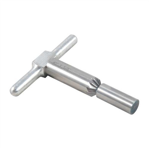 Ce cutter à chanfrein de 45° casse les bords des rayures pour une sortie de balle propre ou chanfreine les bouches de chambre des cylindres de revolver pour des recharges rapides. Il comprend le cutter, une poignée et un pilote, le tout dans une boîte en polypropylène. Le pilote interchangeable maintient le cutter correctement aligné. N'hésite pas à acheter des pilotes supplémentaires pour utiliser un seul cutter pour de nombreux calibres différents. Des pilotes pour d'autres calibres sont disponibles séparément. Le cutter de 45° fourni dans les ensembles marqués d'un * a un diamètre de 5/8\" pour chanfreiner correctement les bouches de canon et de cylindre plus grandes de ces calibres. Tous les autres ensembles ont un cutter de ½\" de diamètre.