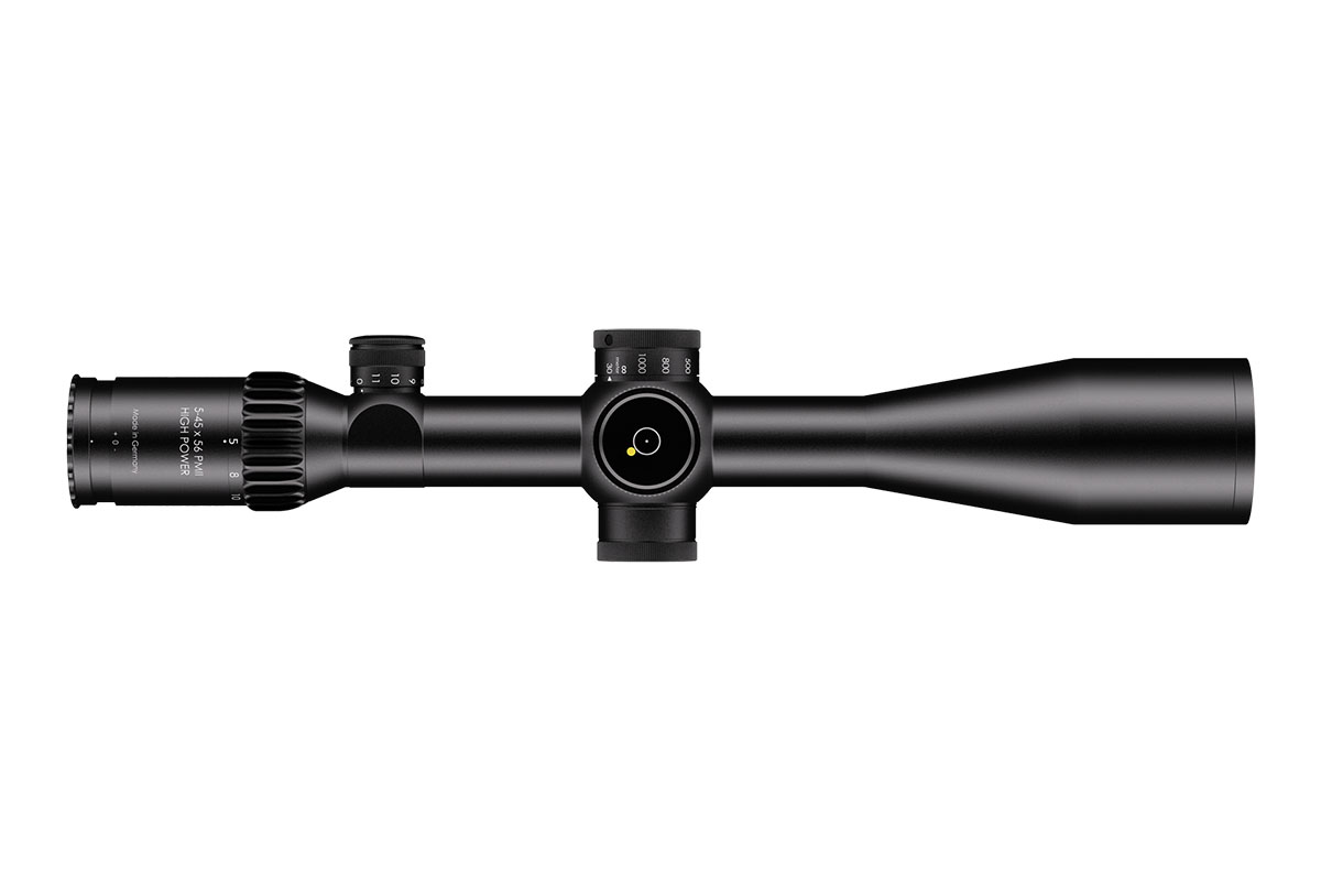 4060537047127 The 5–45×56 PM II High Power is a professional‑grade precision optic that merges a high‑performance riflescope with spotting‑scope capability. Designed for observation and ultra‑long‑range engagement, its enormous 9× zoom range (5–45×) makes it equally at home on reconnaissance, match, or tactical platforms where both identification and shot‑making accuracy are required. Engineered for extreme clarity and reach, the 56 mm objective delivers excellent light gathering while the optical system maintains a large usable field of view across the entire zoom range — allowing fast situational awareness at low magnification and razor‑sharp detail at high power. The reticle sits in the first focal plane, so hold‑offs and subtensions remain precise at any magnification. The model features robust, lockable turrets with fine 0.1 mrad click values and very large usable internal adjustment ranges tailored for extreme‑range correction. Built on a rugged 34 mm main tube, the High Power is constructed for demanding environments: it is fully weatherproof, fogproof and shock‑resistant. Despite its long reach, the design balances mechanical strength with practical ergonomics for field use. Standout Features Exceptional 5–45× magnification range for combined observation and precision shooting Large 56 mm objective for outstanding light transmission and image resolution First focal plane reticle for accurate ranging and holdover at any magnification Precision turrets with 0.1 mrad click value and extensive elevation/windage adjustment range Side/parallax adjustment for crisp focus from mid‑range to extreme distances High optical transmission (~90%) and illuminated reticle options for low‑light operations Robust 34 mm tube, weatherproof and built for professional use Key Specifications Magnification: 5–45× Objective diameter: 56 mm Main tube diameter: 34 mm Field of view: approx. 7.8–0.9 m @ 100 m Exit pupil: approx. 8.8–1.2 mm Eye relief: 90 mm Length: approx. 434 mm Weight: approx. 1,130 g Reticle: FFP (various tactical reticle options) Click value: 0.1 mrad Elevation adjustment range: ~27 mrad (internal ~29.6 mrad) Windage adjustment range: ±6 mrad (internal ~21.1 mrad) Parallax: adjustable Illumination levels: multiple (illuminated reticle available) Optical transmission: ~90% Designed and manufactured to professional standards, the 5–45×56 PM II High Power is the go‑to optic for operators and precision shooters who require unmatched versatility, extreme reach and uncompromising optical and mechanical performance.
