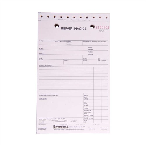 Entdecke die REPAIR LOG BOOKS und REPAIR LOG INVOICE FORMS von BROWNELLS, speziell für Büchsenmacher entworfen. Diese Formulare helfen Dir, eingehende Reparaturen festzuhalten und sie während des Abrechnungsprozesses zu verfolgen.
