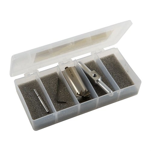 050806016255 Der gehärtete Stahl, 90° Bearbeitungs-Cutter bringt eine Mündung nach dem Kürzen in Form; oder nutze ihn zur Reparatur von Dellen und Beschädigungen. Enthält einen Griff und einen Pilot, alles in einer Polypropylen-Box. Der austauschbare Pilot sorgt dafür, dass der Cutter richtig ausgerichtet bleibt. Kaufe zusätzliche Piloten, um einen Cutter für viele verschiedene Kaliber zu verwenden. Piloten für andere Kaliber sind separat erhältlich.