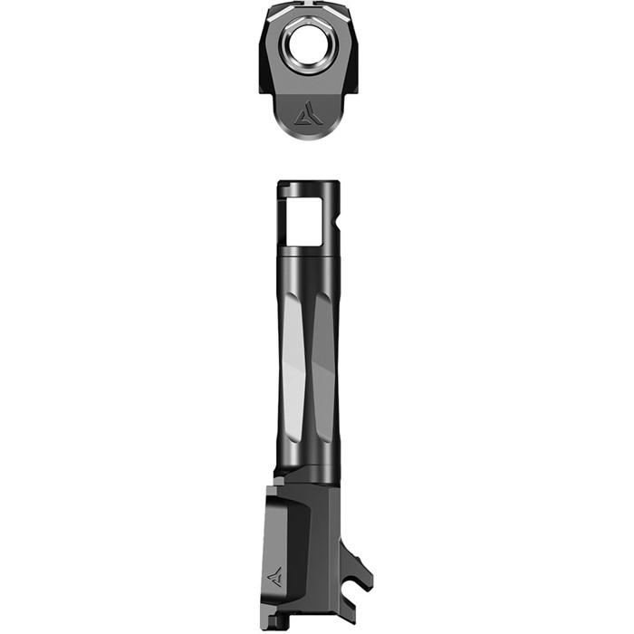 810098420662 Das Radian® AFTERBURNER™ + RAMJET™ Set bietet unvergleichliche Rückstossreduzierung und Präzision auf Wettkampfniveau in einem verdeckten Tragepaket. Das fadenlose Laufdesign ermöglicht eine mühelose Installation/Entfernung zur Reinigung und ist LEGAL FÜR DEN VERKAUF IN ALLEN 50 BUNDESSTAATEN*. Der AFTERBURNER™ Kompensator ist aus gehärtetem Edelstahl gefertigt, während der RAMJET™ Lauf aus gehärtetem 416R SS besteht; beide sind mit einer Radianite Black Beschichtung versehen. Diese Kombination sorgt für geringe Reibung, hohe Härte und hohe Korrosionsbeständigkeit, was die allgemeine Haltbarkeit und Erosion durch Mündungsfeuer zu einem Non-Problem macht. Die schrägen Vorderseiten des AFTERBURNER™ erleichtern das Holstern. Das INTRA-LOK® Montagesystem nutzt das Prinzip der konischen Verriegelung; eine konische Verriegelungsschraube greift in eine schräge V-Rille auf der Unterseite des Laufs. Dies synchronisiert den Kompensator perfekt, wenn er sich auf das obere Laufprofil am Mündungsende des Laufs verriegelt. INTRA-LOK® ermöglicht es dem Benutzer, den Kompensator einfach über den Lauf zu schieben, die Verriegelungsschraube einzuführen und festzuziehen, was einen einfachen und wiederholbaren Installationsprozess ermöglicht. Dieses System erlaubt es dem Benutzer, den Lauf einfach aus dem Schlitten zur Reinigung zu entfernen. MERKMALE AFTERBURNER™ Gehärteter SS RAMJET™ Gehärteter 416R SS Wettkampfniveau Lauf Gasdichtungsraum Indikator für geladenen Raum