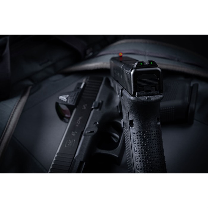 - Eine ProGlo-Stil Vorderklinge mit einer lebhaften grünen Tritiumlampe, umgeben von einem hellen orangen Rand, der dir hilft, das Vordersicht unter Stress schnell zu identifizieren.