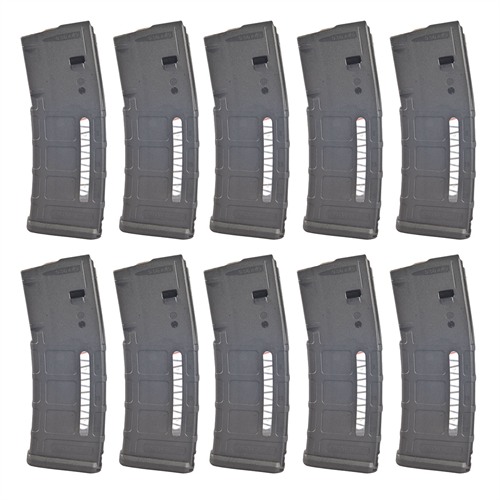 Exceptionally rugged, combat- and competition-ready magazine functions flawlessly, even when left fully loaded for extended periods. Corrosion-proof, self-lubricating one-piece body of fiber-reinforced, molded polymer has no spot welds or joints to impair the follower, and the constant internal curve ensures smooth, unobstructed movement of the round stack. Anti-tilt follower stabilizes the stack to help prevent nose-diving and bolt-over-head failures. Heat-treated, stainless steel spring is stress-relieved for optimal performance. Withstands the heat from prolonged full-auto fire and is not harmed by most bore cleaners and solvents. Exterior ribbing provides added gripping surface; magazine catch notch, rather than a traditional hole, keeps dirt and debris out. Easy-to-grasp ledge on floorplate aids in extracting magazine from pouches; floorplate removes easily for cleaning. Curved-body 30-Round model in MagLevel configuration with windows on both sides of the magazine and a bright, orange indicator to display ammo level. All models available in Black.