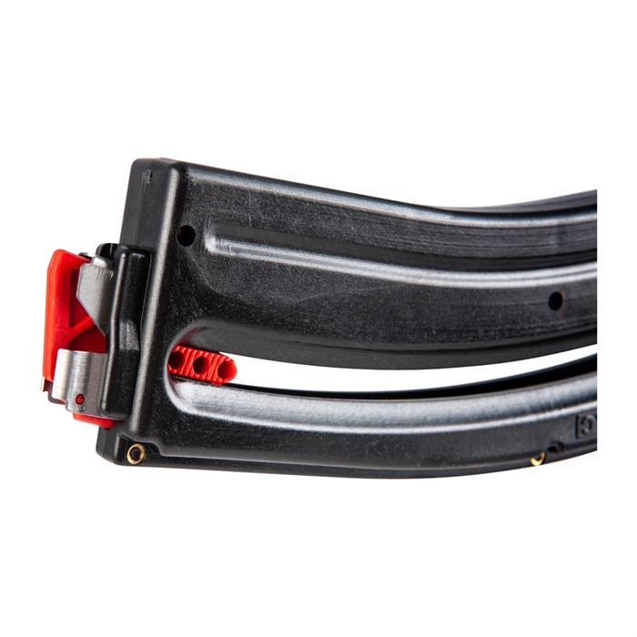Charger les 32 cartouches est également facilité par l'onglet de tirage intégré. Attention : N'utilise jamais cette fonctionnalité sans charger de munitions dans le chargeur. Glisser l'assistance du pouce vers le bas du chargeur puis relâcher l'assistance à sa position d'origine endommagera probablement les pièces internes. Si cela se produit, la garantie est annulée.