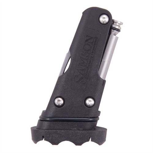 Ein nachfüllbares Edelstahlrohr hält genau genug Öl für eine Feldschmierung. Nutze die Drahtbürste zur Reinigung des Verschlusses und des Trägerschlüssels oder entferne die Bürste und befestige sie am Zugkabel für die Laufreinigung, indem du den Hülsenextraktor als T-Griff verwendest. A2 passt in einen Standard-A2-Pistolengriff.