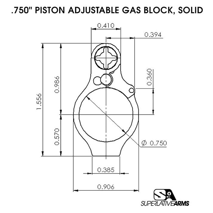 SUPERLATIVE ARMS LLC AR-15 ADJUSTABLE PISTON SYSTEM W/0.750" GAS BLOCK LEFT HAND The Superlative Arms patent pending “Bleed Off”, direct impingement, gas block for the AR15 platform adjusts the gas flow by bleeding the gas out of the block instead of restricting the flow like conventional adjustable blocks. NOT RATED FOR 300 BLACKOUT IN PISTOL LENGTH Results: The pressure used in the block is reduced only to the amount required to drive the bolt carrier. The remaining gas / pressure are bled out of the block allowing the system to run much cleaner and cooler. Reduction of felt recoil. Patented adjustment detent is located outside of the block and therefore no contamination. The gas adjustment screw does not restrict the gas flow; therefore there is no erosion or seizing of the screw / no loss of detent due to carbon build up. Although it is removable, we have added a safety mechanism, which stops you from unintentionally backing the screw all the way out. When using SBR’s and / or suppressors the bleed off port allows the excessive pressure to be exhausted out of the block reducing blow back. DATA: Firearm Type: AR15 Gas Length: Pistol, Carbine, Mid-Length, and Rifle Weight: 12.8 oz., 13.1 oz, 13.4 oz, and 13.8 oz Piston Block Attachment Type: Clamp On, Socket Head Cap Screws Piston Block Material and Finish: 416 SS, Melonite Carrier: Ion Bonded, 1 pc. Carrier w/ Skis and Dimpled Key Gas Adjustment: 30 Locked Positions, Front Of Block Bleed Off Port: Front Of Block INCLUDED: Piston Block Assembly Carrier (bolt not included). (1) 3/32" X 6" Hex Key (tool to adjust gas screw) (1) 9/64" X 6" Hex key (tool to install/remove gas block plug) (1) Bushing and insert tool Installation Instructions & QR Code For Video Tutorial