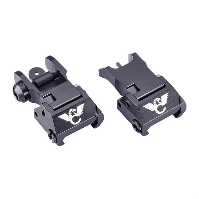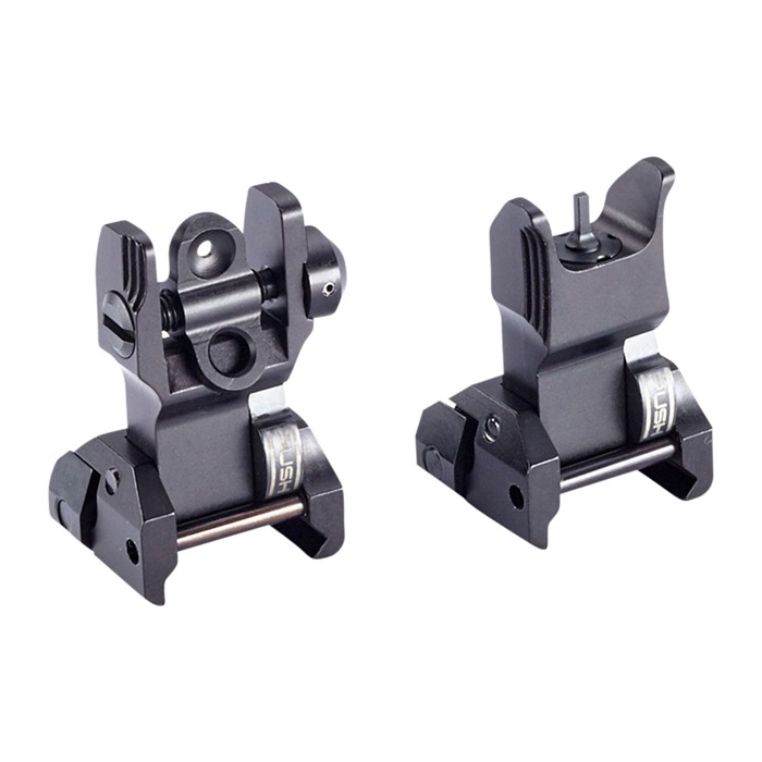 Made in the USA from mil-spec, hard-anodized aluminum, these sights are a rugged, click adjustable option for your next AR rifle or pistol build. These high-quality folding front and rear sights easily clamp on any standard Picatinny rail and have a positive, upright steel locking mechanism for rigid, accurate durability under heavy use. The elevation adjustable front sight has a standard A2 front sight post and is compatible with most aftermarket front sights. The anti-snag rear sight is low profile, finger adjustable for windage and has a dual peep with a .200” and .075” aperture. Made in USA from mil-spec anodized aluminum Folding sights with a low profile when not in use Steel upright locking mechanism Standard AR-15 heights with low-profile windage adjustment and standard front sight elevation adjustment.