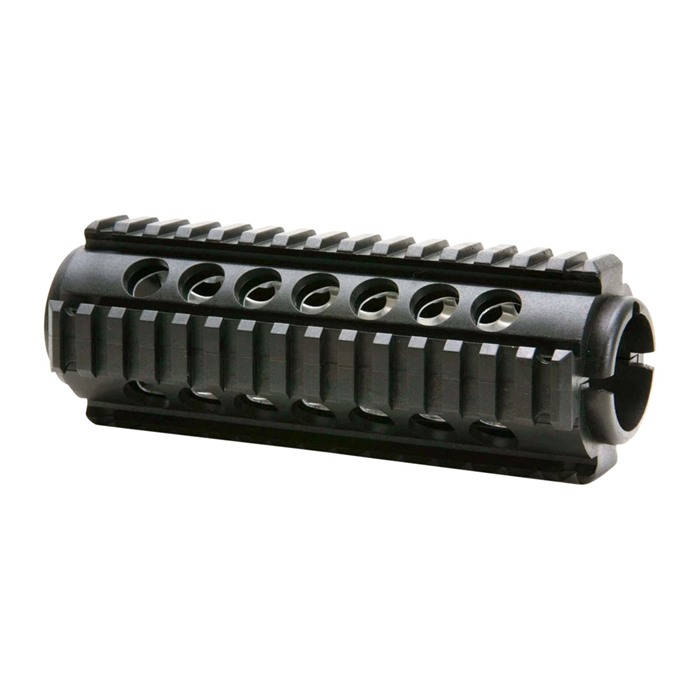 Looking to attach accessories quickly and easily to your AR-15 carbine? This two-piece Quad-Rail Handguard provides plenty of Picatinny attachment points at four points around the circumference of the handguard, allowing owners to mount lights, lasers and other accessories with ease. The two-piece Quad Rail Handguard is molded from glass-filled nylon polymer, a high-impact material that's designed to handle the stresses of range and field use. The mil-spec rails are located at the 9-, 12-, 3- and 6-o'clock positions around the handguard, and each handguard half also features aluminum heat-shield inserts that protect a shooter's support hand from barrel heat.