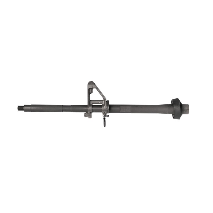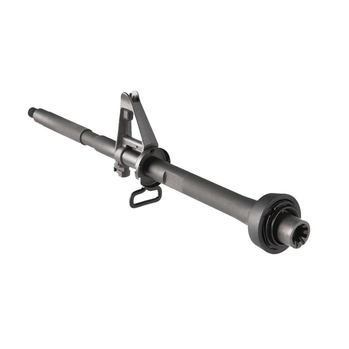Brownells Government Barrel Assemblies – Chrome Lined and Individually Inspected The Brownells Government Barrel Assemblies are manufactured by a US Government Contractor for M4 barrels, and held to exacting standards. These barrels all feature a hard chrome bore, applied over button rifling. Each barrel is High Pressure Tested, followed by Magnetic Particle Inspection & Gauging to ensure there are absolutely zero imperfections. Assemblies are as ready-to-install as possible, with slip ring assembly, F-Marked front sight base and handguard cap pre-installed. Handguard caps are appropriate for the barrel length, with M4 Carbine assemblies featuring a round cap, and the rifle length featuring the proper triangle. Barrel material is 4150 chrome moly steel. 5.56x45mm chamber and 1-7 twist will ensure acceptance and desired performance with 62 grain and greater bullets. Barrels are all marked: “5.56x45mm NATO MFR 12238 MP HP 1-7”.