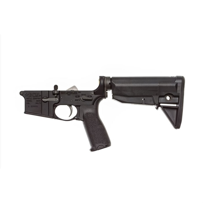 BCM COMPLETE LOWER RECEIVER W/ BCMGUNFIGHTER™ STOCK FOR AR-15 A long time popular item with many Brownells customers, the BCM® AR-15 Complete Lower Receiver is a perfect choice when building up a no-nonsense AR for defense, training, competition, or any situation where reliability is a must. Whether you are looking to simply do a “Two Pin” build by attaching a complete upper receiver or you are building out a customer upper, the BCM® Complete Lower Receiver is an easy and dependable way to complete your build. Machined from 7075-T6 aluminum forgings with a Mil-Spec hard coat anodized finish, the lower receiver is completed with the BCM® small parts that keep this receiver as reliable as you would assume with the BCM® reputation. The trigger is the BCM® PNT™ trigger which has a nickel teflon finish and is un-notched to be compatible with 9mm use, and the BCM® trigger guard gives extra space when shooting with gloved hands. The popular BCM® Mod 4 Pistol Grip comes standard on the lower receiver. A BCMGUNFIGHTER™ Stock is available in your choice of Black and Flat Dark Earth on a Mil-Spec receiver extension which also includes a BCM® QD Endplate and staked castle nut. SPECS Machined Aluminum Forgings 7075 T6 Hardcoat Anodizing: MIL-A-8625F, Type III, Class 2 Caliber marked as “Multi” Includes a USGI H buffer Build with confidence and ease with the BCM® AR-15 Complete Lower Receiver.