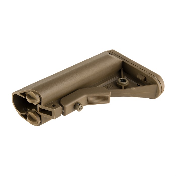 Currently employed by the U.S. military, this reinforced polymer stock fits M4-type receiver extensions and offers an improved cheekweld designed for increased comfort and consistency. Two waterproof storage compartments running the length of the stock hold 2 AA or 3 CR-123 batteries. Streamlined contours resist snagging on clothing, equipment, or vegetation to aid in safe and stealthy operation. Sure-Grip stock latch ensures convenient and intuitive length-of-pull adjustment, while the anti-slip rubber recoil pad secures the weapon to the operator’s shoulder. Features a black, stainless steel QD swivel mount and two molded 1¼" wide sling slots.