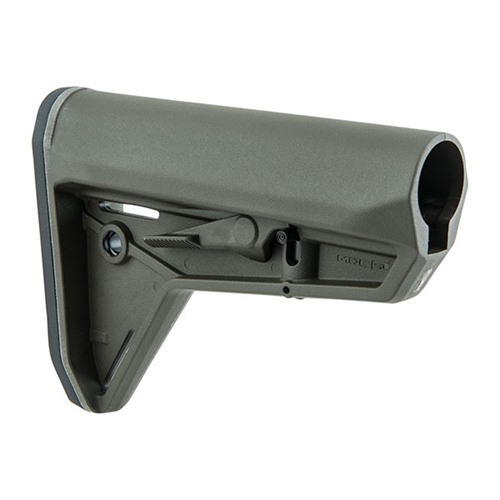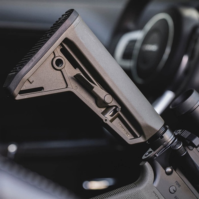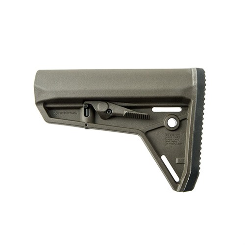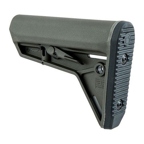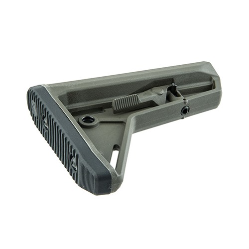 SPECS: Molded polymer, Black, Dark earth, OD Green, and Gray. LOP adjustment range: 3.3" (8.4cm). 7.2" OAL. 9.6 oz. (272.2g) wt. Mil-Spec fits mil-spec 1.14" O.D. carbine buffer tubes.