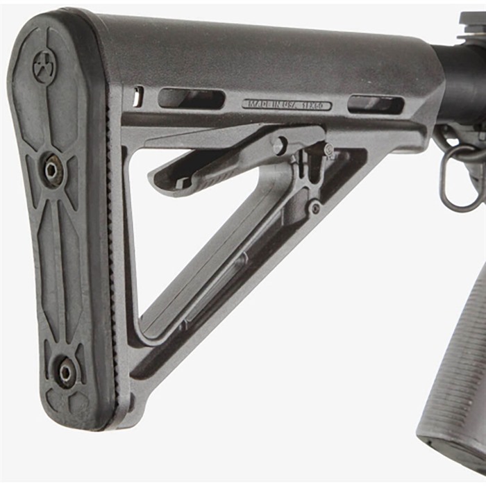 Magpul Original Equipment (MOE) carbine buttstock provides the quality, durability, and ergonomic benefits of Magpul’s CTR stock in a rugged, economical, drop-in package. Strong, A-frame design is lightweight and comfortable, yet provides operator with plenty of support. Comb contour is wider than standard issue M4 stock to help shooter maintain a solid, consistent cheekweld. Streamlined exterior and protected release lever won’t snag on clothing, gear, vehicle interior, or vegetation. Heavy duty, spring-loaded release lever allows fast length-of-pull adjustments and won’t dig into your hand. Impact- and heat-resistant, polymer construction includes molded-in reinforcements at stress points, plus two slots for web slings and a hole for a toe-mounted sling swivel or clip-on sling. Soft, synthetic rubber buttpad increases comfort and helps prevent slippage. Mil-Spec fits 1.14" O.D. buffer tubes on Colt-manufactured M4 and similar mil-spec tubes that accept both four- and six-position collapsible stocks.