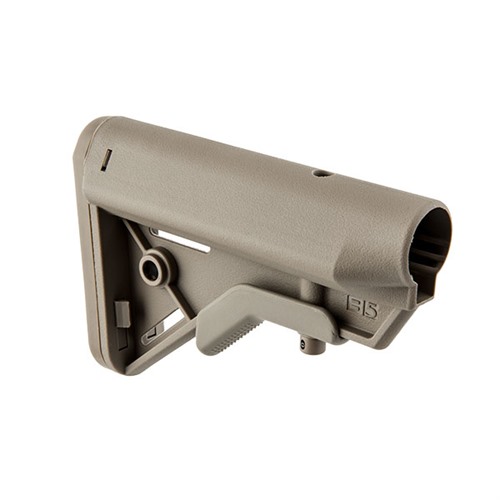 B5 SYSTEMS BRAVO COLLAPSIBLE MIL-SPEC STOCK FOR AR-15 Building upon the success of the B5 Systems Enhanced SOPMOD, B5 has taken the features end users demand; offering them in a lighter, more compact, and stronger buttstock. The Bravo stock maintains the SOPMOD cheek weld, one piece anti-rotation quick disconnect sling mount, non-slip cushioned buttpad, and improved sure grip stock latch. The Bravo omits the storage capability of the SOPMOD to provide a slimmer profile and angles the rear of the stock ensuring quick and consistent stock placement against the shoulder and cheek. Made of Mil-Spec materials and finishes. Currently employed by the U.S. military, this reinforced polymer stock fits M4-type receiver extensions and offers an improved cheekweld designed for increased comfort and consistency. Streamlined contours resist snagging on clothing, equipment, or vegetation to aid in safe and stealthy operation. Sure-Grip stock latch ensures convenient and intuitive length-of-pull adjustment, while the anti-slip rubber recoil pad secures the weapon to the operator’s shoulder. Features a black, stainless steel QD swivel mount and two molded 1¼" wide sling slots. FEATURES Ergonomic Cheek Weld Color-Matched Steel Hardware Fixed Sling Mounts and Steel Anti-Rotational QD Mounts Cushioned Non-slip Buttpad with Built in M4 Multi-Tasker® Tool Holder (tool sold separately) Sure Grip Stock Latch Made of MIL-SPEC Materials and Finishes Fits MIL-SPEC Carbine Receiver Extensions SPECS Weight: 9.3 oz Length: 7.2 in Width: 2 in Height: 4.9 Black and Tan models are TACOM approved and on the Additional Authorization List (AAL) for the M4/M4A1. Black NSN: 1005-01-706-2373 Flat Dark Earth NSN: 1005-01-706-2510