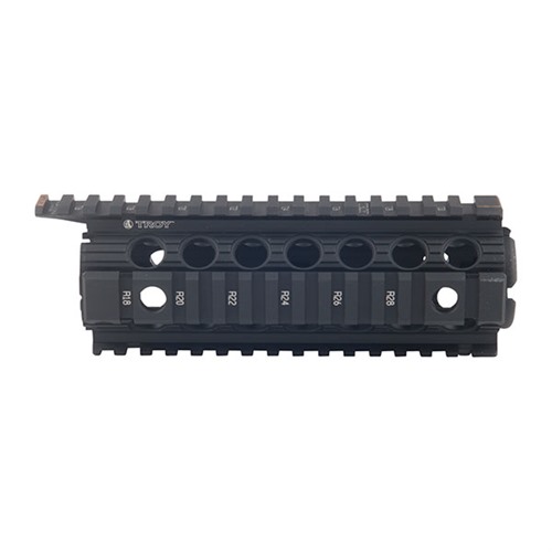Troy’s Enhanced Drop-In Rail is a non-free-floating direct replacement for all M4/M16 plastic hand guards utilizing the carbine, mid-length, and rifle-length gas systems. Easy to install; no gunsmithing required. Includes MIL-STD Picatinny Rails at 12, 3, 6, and 9 o’clock and four built-in sockets for Q.D. Swivels. Machined from hardened aircraft aluminum with stainless steel components and finished in MIL-SPEC hardcoat anodizing.