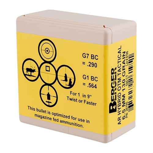 Berger 130 Grain AR Hybrid OTM (Open Tip Match) Tactical Bullets utilize their industry-leading hybrid ogive, which blends tangent and secant designs to optimize efficiency, reduce wind-drift, and minimize sensitivity to seating depth. The Hybrid OTM Tacticals are competition proven and a favorite amongst today’s top long range competition shooters. Designed for both bolt action use in cartridges such as the 6.5 Creemoor, 6.5mm Grendel and 260 Remington. Excellent in a gas gun for reliable feeding in magazine applications. Made with J4 Precision Jackets, the AR Hybrid OTM Tactical like all other Berger Bullets, have exacting tolerance and near perfect construction.