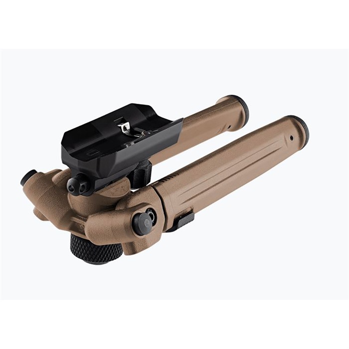 Die Beinstrecker gleiten und verriegeln sicher mit einem Knopfdruck an einem der sieben halben Zollabstand verriegelnden Detents. Die Beine verlängern sich von 6.8” bis 10.3”. Ein branchenexklusives 50° Gesamtneigen wird von einem handschuhfreundlichen, geriffelten, werkzeuglosen Bipod-Verriegelungsknopf gesteuert, der sich zwischen den ausgezogenen Beinen befindet. Im gefalteten Zustand passen das schlanke Gehäuse und die Beine ordentlich unter den Lauf und sind weniger als 2.3” tief und 3.3” breit.
