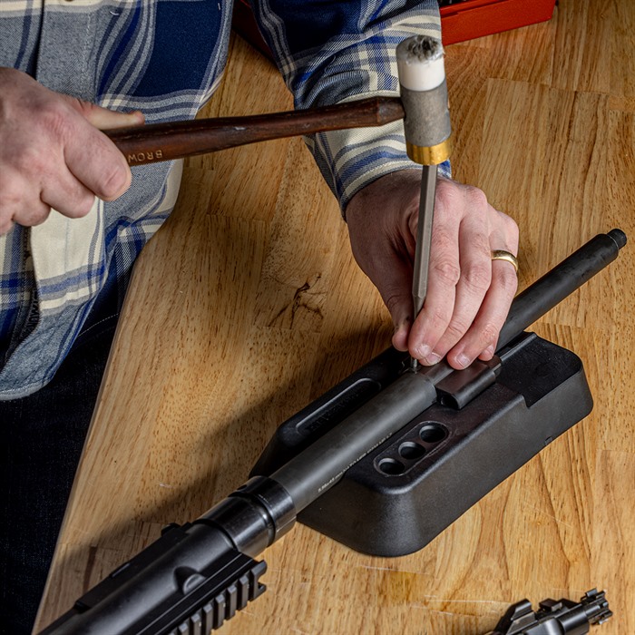 BRN-4/416 BARREL BENCH BLOCK Be ready with the right tools for the job. The Brownells BRN-4 / HK416 Barrel Bench Block was designed to provide a solid durable way to install or remove the gas block on a BRN-4 or HK416 barrel. Our bench block is specifically designed to be compatible with most gas blocks including those that have a front sight and an adjustable knob. Designed with recessed areas to conveniently hold pins and punches to help keep your parts and tools in one spot. The textured bottom helps serve as an anti-slip on most gun mats. Features Three Integrated pockets for punches Recessed pocket for roll pins Polymer Construction Overall dimensions 8.68” L x 4.49” W X1.5” D