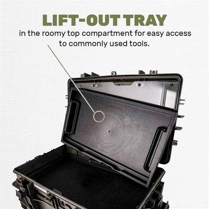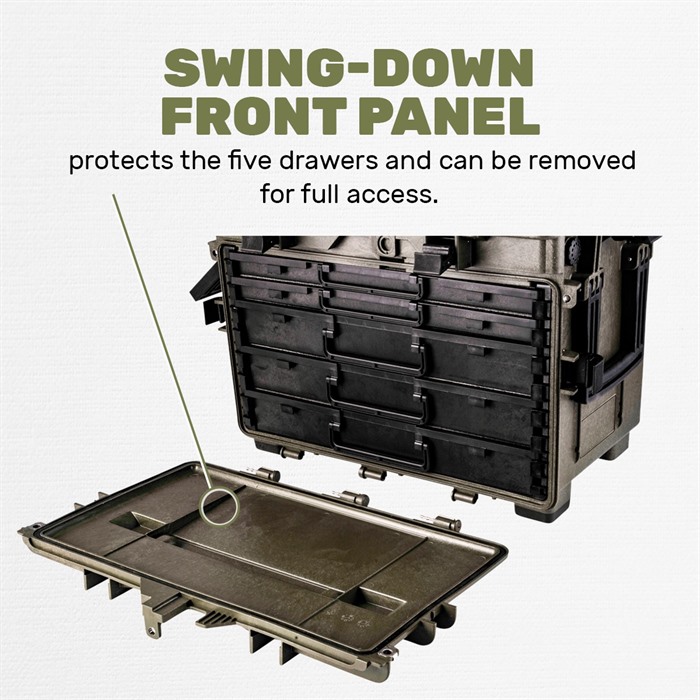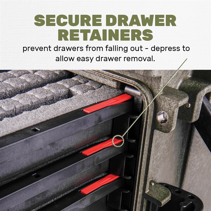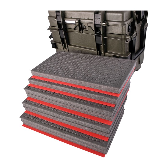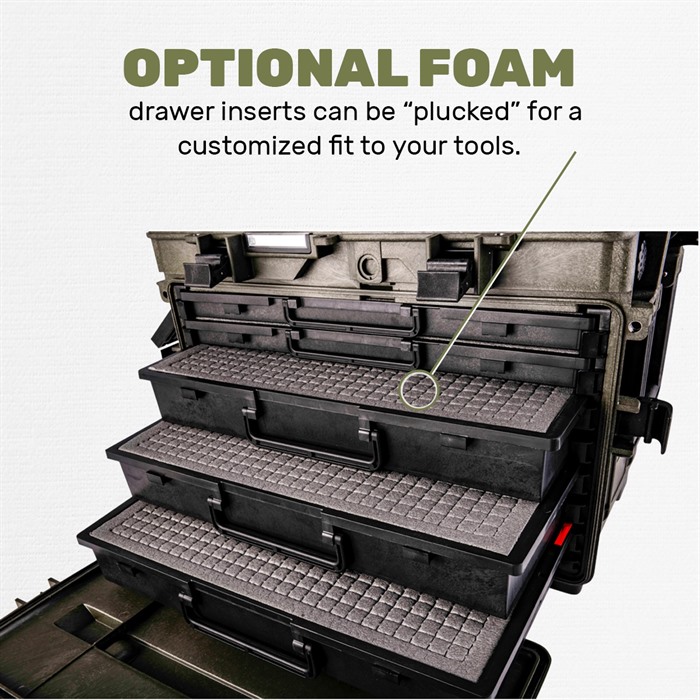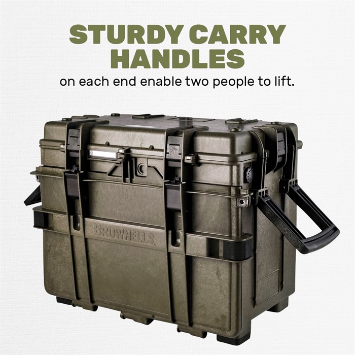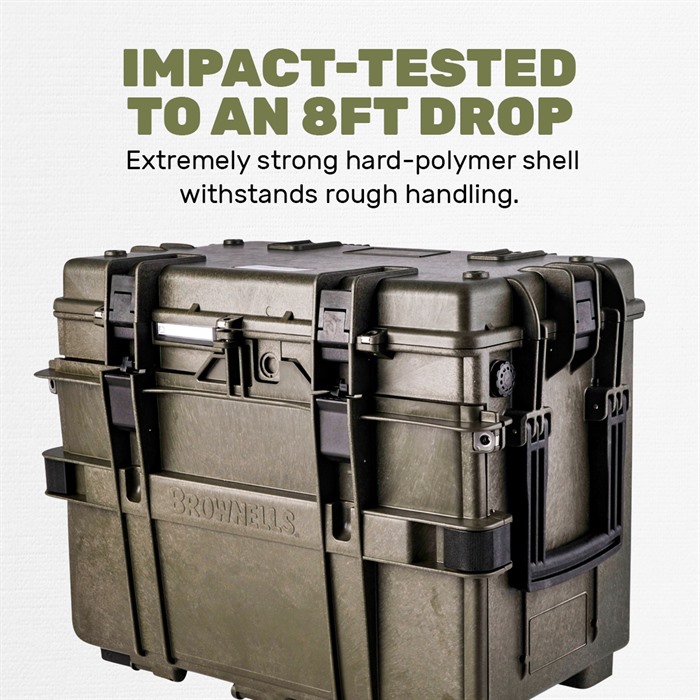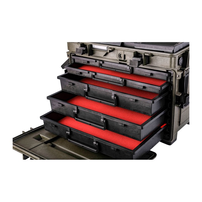 Brownells Generation III Armorers Case – Built to Extreme Testing Standards Enhanced Armorers Case now has the ability to be an easy to access toolbox in your workshop, and quickly configured for transport. Manufactured from durable polypropylene, the Gen III Armorers Case is waterproof and durable enough for any expedition (See below for Test Specifications). With three (3x) 2.4in tall and two (2x) 1.2 in drawers, there is plenty of storage for your essential tools. Case features two carrying handles on either side, as well as top telescoping luggage handle for use with the two integral wheels. Front door and top lid can be removed, by turning a locking screw in the hinge, allowing for easy access to drawers and to compartment when not travelling. Drawers have depressible tabs, that allow complete drawer removal, while also ensuring tools don’t inadvertently fall out. Stackable design ensures any additional Armorers Cases neatly stack for clean organization. Top and front jam free lid latches are easy to operate and firmly secure all sides in transit. Interior of Lid features a clear polymer door, so that documentation, spare parts or additional tools can be stored in otherwise unused space. Optional pluckable foam keeps tools from shifting during transit and protects your investments. Drawer Internal Dimensions: Large Drawer: 2.4 inches Tall x 18.4 inches Wide x 10 inches Deep Small Drawer: 1.2 inches Tall x 18.4 inches Wide x 10 inches Deep Top Removable Tray Internal Dimensions: 1.25 inches Tall x 18 inches Wide x 10.25 inches Deep Total Case Weight: 21.49 lbs Operating Temperature: -27.4°F to 194°F Test Specifications: STANAG 4280 - DEF-STD 81-41 (Part 3 Issue 4) Impact Horizontal Test - 2.5m Impact Vertical Test - 2.5m Vibration Test – 5-350Hz Dry-Heat Test – 68 to 176 °F 50-80% Humidity for 3 hours Low Temp Test Storage Test - -40°F to 194°F, humidity not less than 90%, cycle of 28 times CEI EN 60529 Dust Ingress Test – 2-8 Hours Water Ingress Test – 1m for 30min
