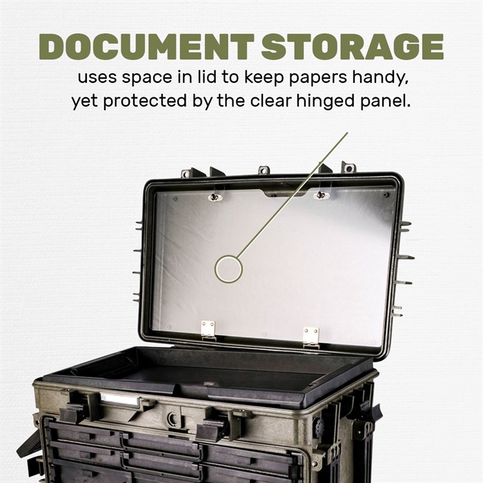 - Im Inneren des Deckels befindet sich eine klare Polymer-Tür, in der Dokumente, Ersatzteile oder zusätzliche Werkzeuge aufbewahrt werden können.
