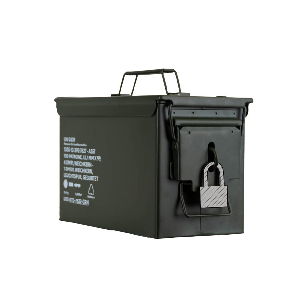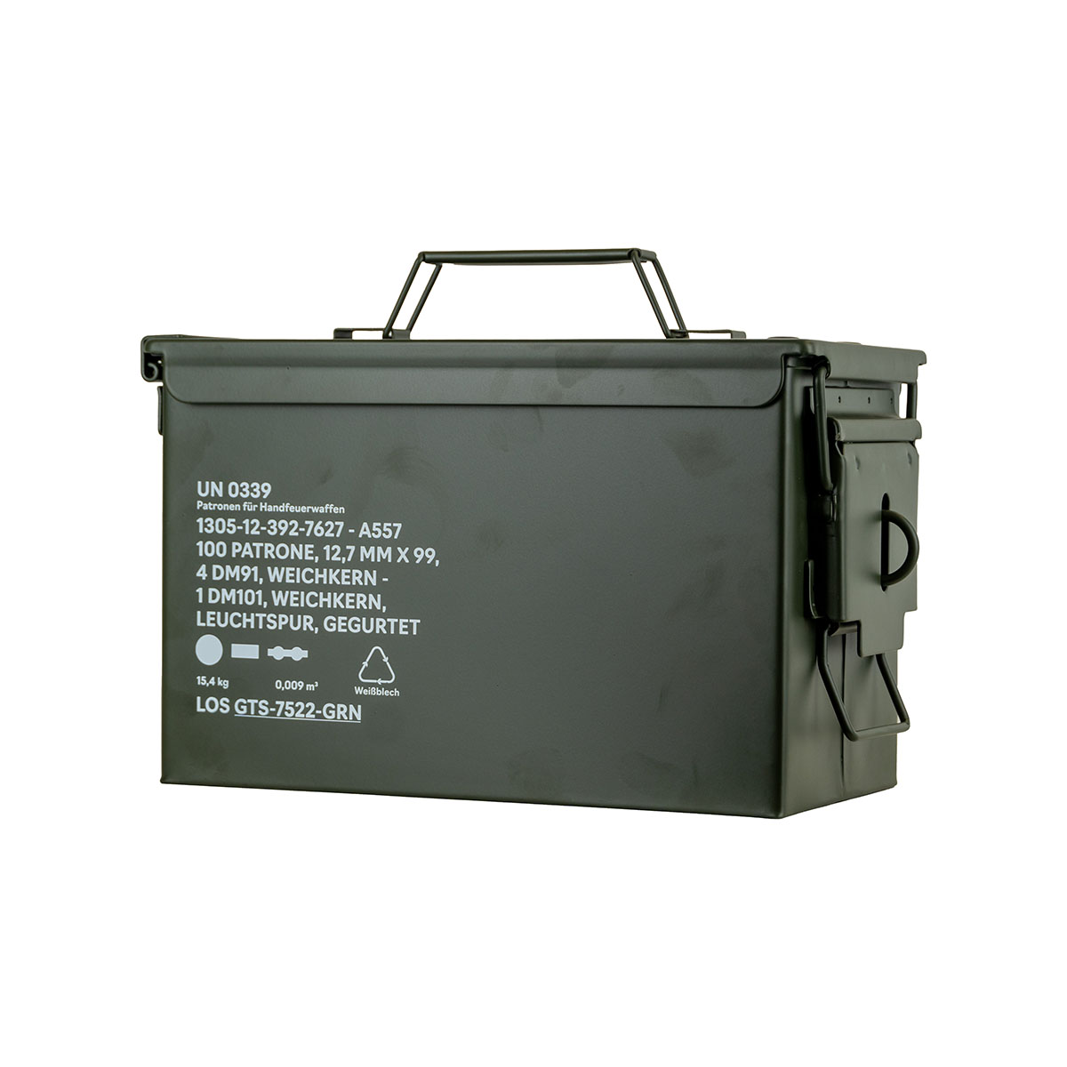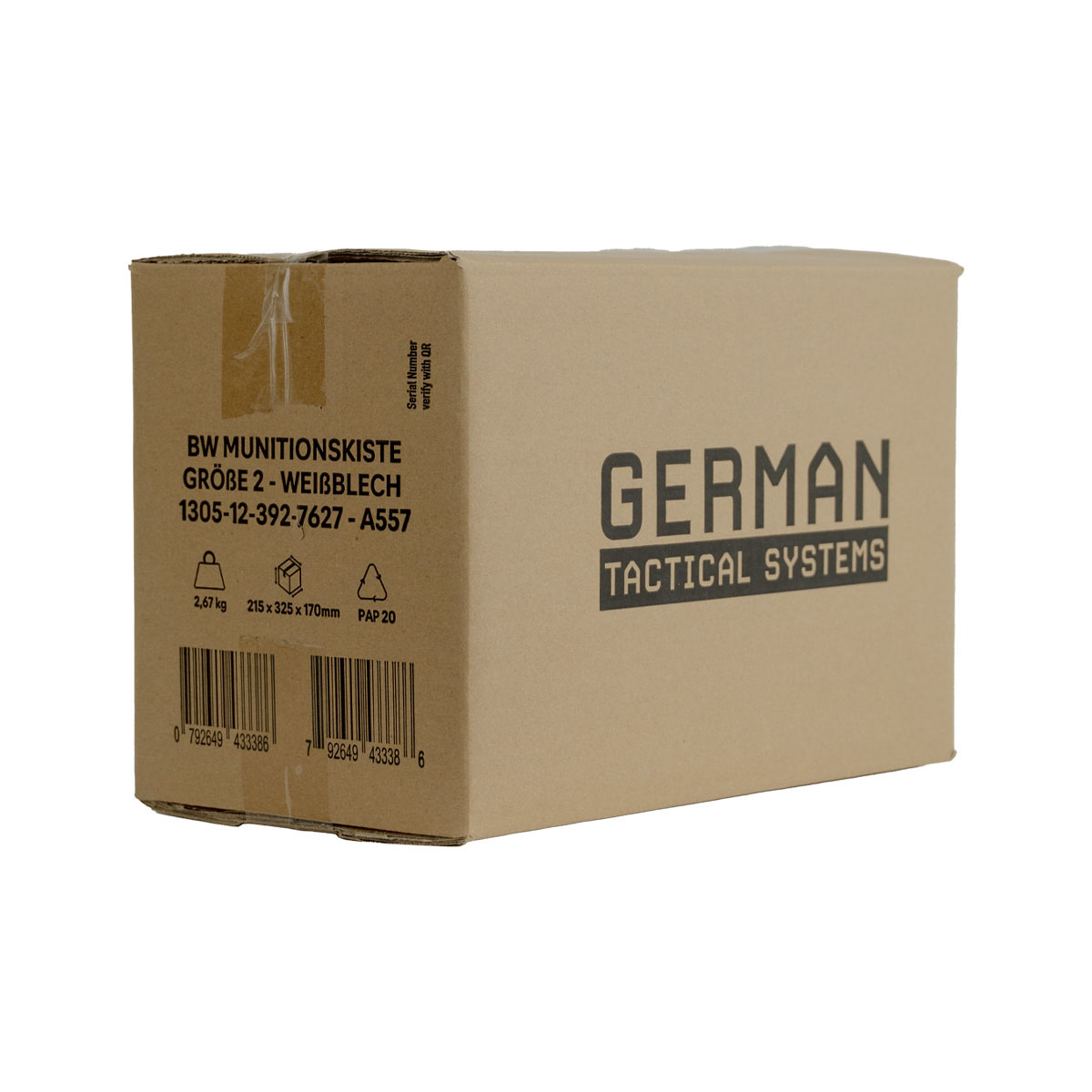 0792649433386 The German Tactical Systems BW Ammo Can (NATO Size 2 (12.7 mm / .50 Cal) is built from rugged tinplate steel, providing dependable protection against dust, moisture, and impacts. Designed for demanding use in the field, during transport, or in storage, it keeps your ammunition and gear secure in any environment. A continuous rubber gasket ensures a tight seal, while the heavy-duty lever-lock latch keeps the lid firmly closed. For extra security, the integrated padlock tab allows you to lock the contents. The foldable steel carry handle makes transport comfortable, even with gloves, and the stackable design is ideal for organized storage and logistics. Key Features: NATO Size 2 (12.7 mm / .50 Cal) – new production from robust tinplate steel Strong lever-lock latch for secure closure Continuous rubber gasket for dust and moisture protection Foldable steel handle for safe, comfortable carrying Integrated padlock tab for added security (lock not included) Stackable design – ideal for storage and transport Color: NATO Green Perfect for storing ammunition, tools, or mission-critical equipment, the GTS BW Ammo Can delivers military-grade reliability for professionals and enthusiasts alike. Pair it with the GTS Gear Dehumidifier to keep contents dry and corrosion-free for long-term storage.Lieferzeit ca. 15-20 Tage aus dem Lager Europa.