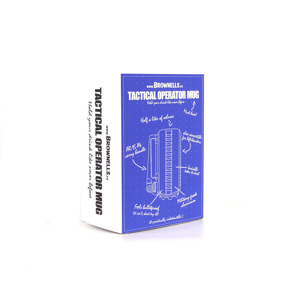 Präsentiert wird der Brownells Tactical Operator Mug – das unverzichtbare Accessoire für alle, die ihre Getränkeaufnahme genauso ernst nehmen wie ihre geheimen Einsätze.