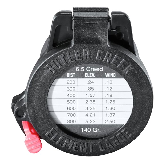 051525000273 Les caches d'objectif Butler Creek Element sont très robustes avec une manche multi-flex. Le disque d'information imprimable à bascule fournit des informations sur le vent et l'élévation.