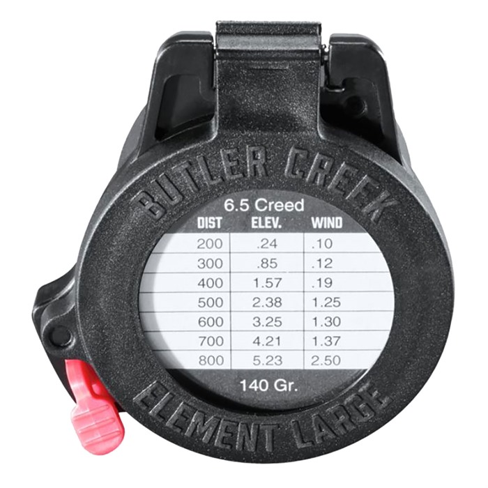 051525000280 Die Butler Creek Element Scope Caps sind äusserst robust und verfügen über einen multiflexiblen Ärmel. Die herausklappbare Zielscheibe mit Druckfunktion bietet Informationen zu Wind und Elevation.