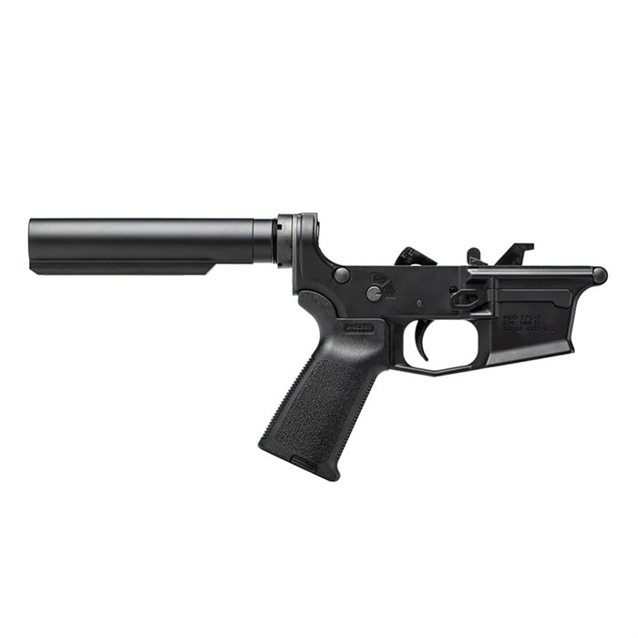 The Aero Precision EPC-9 Complete Lower Receiver is the perfect base for your custom AR9 build. This lower receiver comes without a stock/brace giving the builder flexibility to choose exactly what configuration they want the first time. Included Magpul MOE® grip provides an upgrade in ergonomics from the factory. Includes: EPC-9 Lower Receiver Magpul MOE® Grip Lower Parts Kit Enhanced Buffer Tube EPC 7.7oz Buffer M5 Carbine Buffer Spring Castle nut/end plate These parts are installed EPC-9 Lower Receiver Features: Threaded bolt catch pin for easy installation Integrated enlarged trigger guard to remove any risk of breaking off trigger guard tabs, and provide an overall more rugged platform to build on Threaded takedown pin detent recess to allow for the installation of a detent and spring with a single 4-40 set screw Flared magazine well for quick and easy reloads Proprietary components pre-installed from the factory Standard AR15 takedown/pivot pin lug pattern Machined from custom forged 7075-T6 aluminum Compatible with standard frame GLOCK® magazines