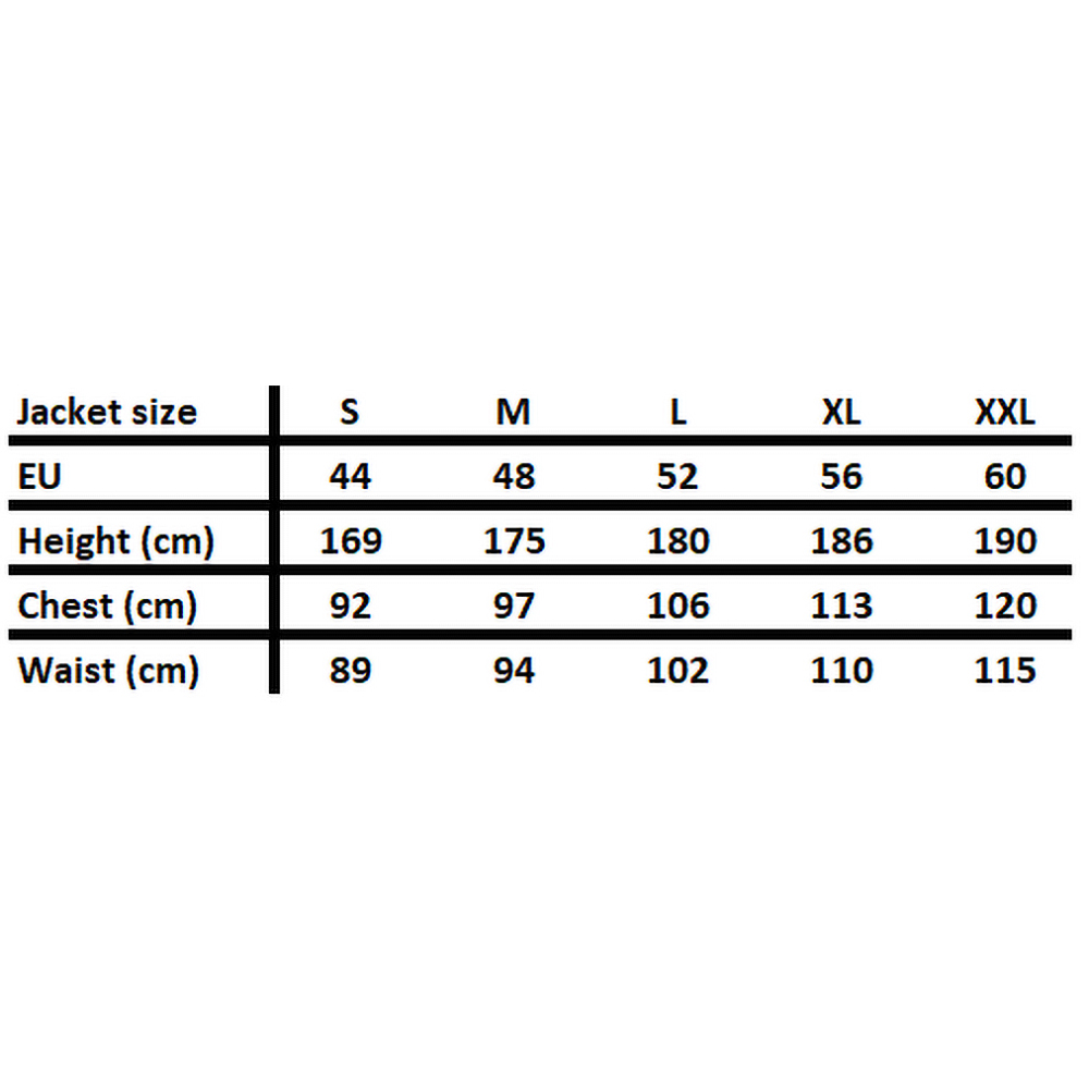 La veste est disponible en cinq tailles différentes : S, M, L, XL, XXL.
