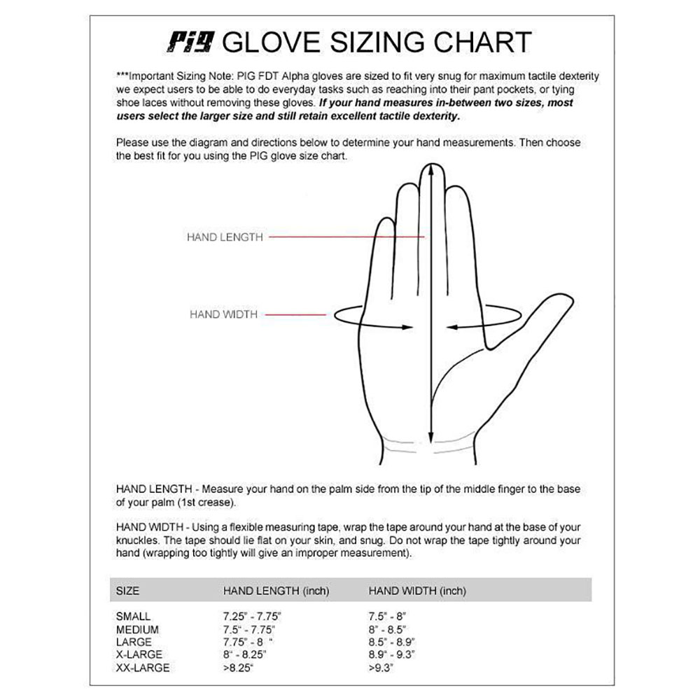 Nota importante: I guanti sono tagliati molto stretti, ma si adatteranno alla mano di chi li indossa. Ti consigliamo di indossarli un po' nella vita quotidiana prima di usarli per il tiro, in modo che si adattino perfettamente a te. Ti preghiamo di dare un'occhiata alla tabella delle taglie per i guanti PIG!