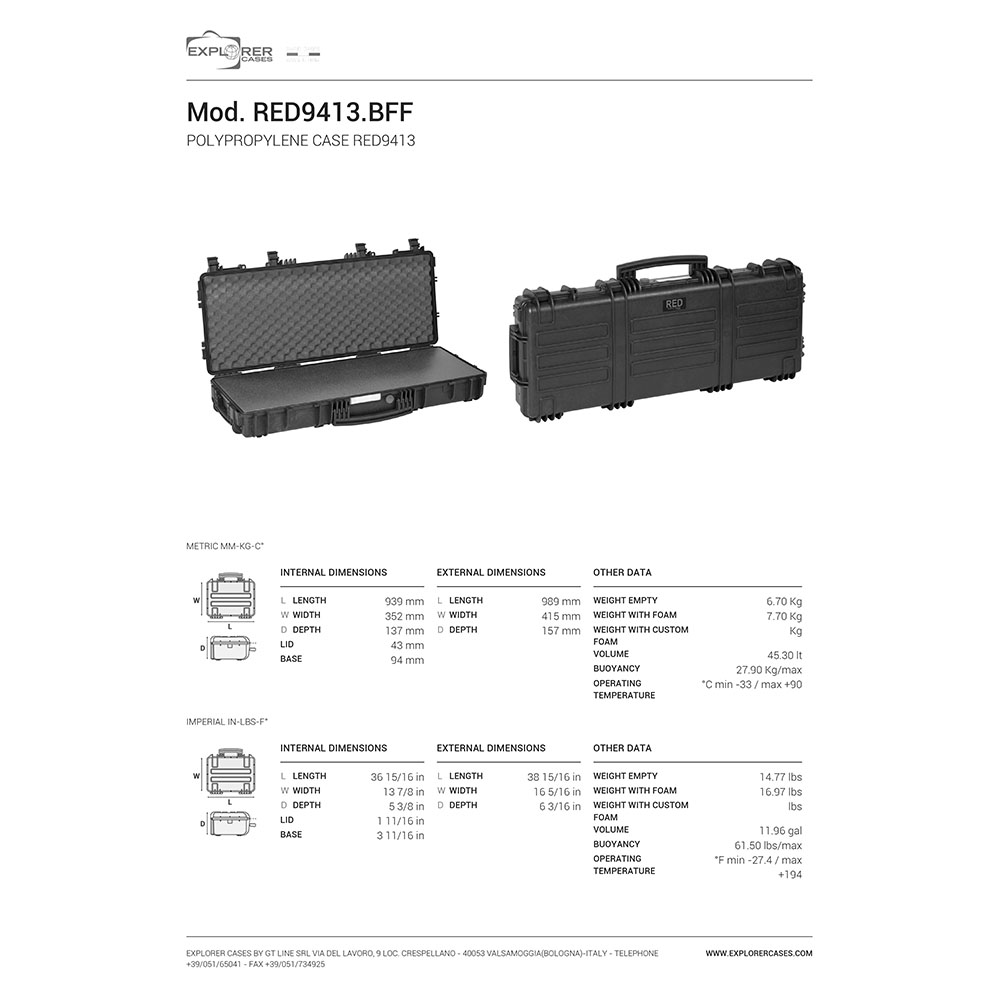 8024482183671 La migliore protezione per il tuo tesoro più prezioso - L'ultimissimo case per armi con una varietà di funzioni nella massima qualità, realizzato da Explorer Cases in Italia. Specifiche: Lunghezza: 989mm (939mm interno) Larghezza: 415mm (352mm interno) Profondità: 157mm (137mm interno) Peso: 7,70kg (6,70kg senza inserto) Colore : Nero Inserto: Density Full Foam Letteralmente indistruttibile I case per armi di Explorer Cases sono dotati di cerniere in metallo resistenti alla corrosione con funzionalità di blocco del coperchio, che fissano la parte superiore e la mantengono in posizione quando è aperta. Quindi puoi stare tranquillo che i tuoi case per armi ti assisteranno per molto tempo. Grazie ai ganci di chiusura, i case per armi sono sempre altamente sicuri. La guarnizione O-ring li rende anche resistenti all'acqua in grande misura. Ogni case per armi è dotato di una valvola manuale di rilascio della pressione dell'aria. Pertanto puoi stare tranquillo e non avrai problemi a maneggiare e chiudere il case. Esattamente come lo desideri I case sono forniti con ritagli interni per supporti o anelli di montaggio interni opzionali, così puoi riporre tutto esattamente come è più adatto alle tue esigenze. Ogni singolo suitcase è dotato di un'etichetta rimovibile impermeabile con cui puoi etichettare la tua attrezzatura o memorizzare i tuoi dati. Il case può essere trasportato tradizionalmente tramite la grande maniglia frontale o tramite spallacci opzionali, che possono essere facilmente attaccati a qualsiasi modello. La serie Mod Red 9413 può anche essere utilizzata come trolley.Tempi di consegna circa 15-20 giorni dal magazzino europeo.