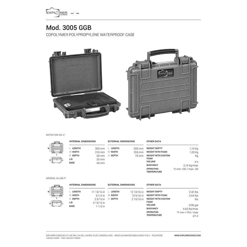 8024482183497 La meilleure protection pour votre précieux bébé - Le caisson d'arme ultime avec une variété de fonctions de la plus haute qualité, fabriqué par Explorer Cases en Italie. Caractéristiques : Longueur : 326mm (300mm à l'intérieur) Largeur : 269mm (210mm à l'intérieur) Profondeur : 75mm (58mm à l'intérieur) Poids : 1,20kg (1,10kg poids à vide sans insert) Couleur : Noir Insert : incl. Gunbag Littéralement indestructible Les caissons d'arme d'Explorer Cases sont dotés de charnières en métal résistantes à la corrosion avec des fonctionnalités de maintien du couvercle, qui fixent le couvercle et le maintiennent en place lorsqu'il est ouvert. Vous pouvez donc être assuré que vos caissons d'arme vous accompagneront pendant très longtemps. Grâce aux verrous, les caissons d'arme sont toujours hautement sécurisés. Le joint O-ring les rend également très résistants à l'eau. Chaque caisson d'arme est équipé d'une soupape de décharge de pression manuelle. Vous pouvez donc vous détendre et n'aurez aucun problème à manipuler et fermer le caisson. Exactement comme vous le souhaitez Les caissons sont fournis avec des découpes internes pour des supports internes ou des anneaux de montage optionnels, afin que vous puissiez ranger tout exactement comme cela convient le mieux à vos besoins. Chaque valise est livrée avec une étiquette amovible étanche que vous pouvez utiliser pour étiqueter votre équipement ou stocker vos données. Le caisson peut être transporté traditionnellement via la grande poignée avant ou via des sangles d'épaule optionnelles, qui peuvent être facilement attachées à n'importe quel modèle. La série 3005 est optimisée pour le transport par avion.