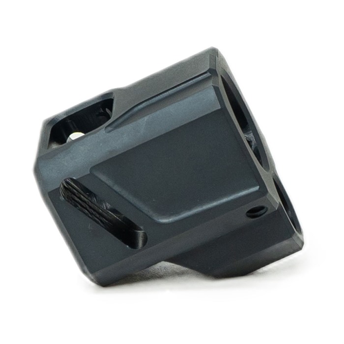 Der Kompensator besteht aus 6061 Aluminium mit einer schwarzen anodisierten Oberfläche und verfügt über ein einzigartig geneigtes Frontport-Design mit einem einzelnen Kammer. Dies ermöglicht es dem Kompensator, die Konsistenz zu verbessern und gleichzeitig den Mündungshochgang und Rückstoss zu reduzieren. Die geneigten Ports lassen das Gas nach oben ablenken, anstatt nur seitlich, wodurch die Auf- und Abbewegung der Mündung verringert und die Zuverlässigkeit verbessert wird.