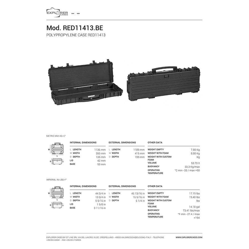 8024482182865 Der beste Schutz für dein wertvollstes Baby - Die ultimative Waffentasche mit einer Vielzahl von Funktionen in höchster Qualität, hergestellt von Explorer Cases in Italien. Technische Daten: Länge: 1189mm (1136mm innen) Breite: 415mm (350mm innen) Tiefe: 159mm (135mm innen) Gewicht: 7,80kg Farbe : Schwarz Wörtlich unzerstörbar Die Waffentaschen von Explorer Cases verfügen über korrosionsbeständige Metall-Scharnieren mit Deckelstützen, die den Deckel fixieren und in Position halten, wenn er geöffnet ist. So kannst du sicher sein, dass deine Waffentaschen dir lange Zeit treu bleiben. Dank der abschliessbaren Riegel sind die Waffentaschen immer hochsicher. Die O-Ring-Dichtung macht sie zudem bis zu einem hohen Grad wasserfest. Jede Waffentasche ist mit einem manuellen Druckentlastungsventil ausgestattet. Daher kannst du entspannt sein und hast keine Probleme beim Handhaben und Schliessen der Tasche. Genau wie du es möchtest Die Taschen sind mit internen Ausschnitten für optionale Innenhalterungen oder Montageringe ausgestattet, sodass du alles genau so verstauen kannst, wie es für deine Anforderungen am besten geeignet ist. Jede einzelne Tasche kommt mit einem wasserdichten abnehmbaren Etikett, mit dem du deine Ausrüstung kennzeichnen oder deine Daten speichern kannst. Die Tasche kann entweder traditionell über den grossen Frontgriff oder über optionale Schultergurte transportiert werden, die einfach an jedem Modell angebracht werden können. Die Mod Red 11413 Serie kann auch als Trolley-Tasche verwendet werden.Aus dem Programm genommen
