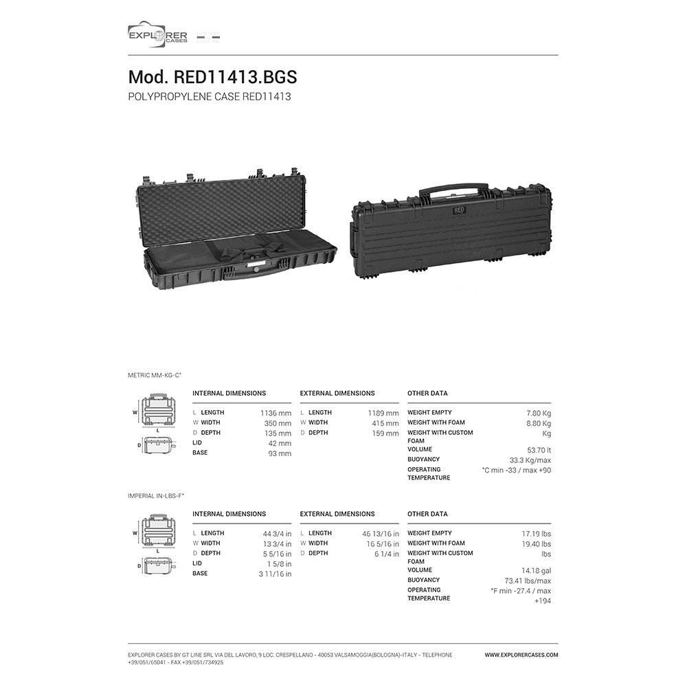 8024482182971 Der beste Schutz für dein wertvollstes Baby - Der ultimative Waffenkoffer mit einer Vielzahl von Funktionen in höchster Qualität, hergestellt von Explorer Cases in Italien. Technische Daten: Länge: 1189mm (1136mm innen) Breite: 415mm (350mm innen) Tiefe: 159mm (135mm innen) Gewicht: 8,80kg (7,80kg ohne Einlage) Farbe : Schwarz Einlage: inkl. Gunbag Wörtlich unzerstörbar Die Waffenkoffer von Explorer Cases verfügen über korrosionsbeständige Metall-Scharnieren mit Deckelhalterungen, die den Deckel fixieren und in Position halten, wenn er geöffnet ist. So kannst du dir sicher sein, dass deine Waffenkoffer dir lange treue Dienste leisten werden. Dank der abschliessbaren Riegel sind die Waffenkoffer stets hoch gesichert. Die O-Ring-Dichtung macht sie zudem weitgehend wasserdicht. Jeder Waffenkoffer ist mit einem manuellen Luftdruckventil ausgestattet. Daher kannst du es entspannt angehen und hast keine Probleme beim Handhaben und Schliessen des Koffers. Genau wie du es willst Die Koffer sind mit internen Ausschnitten für optionale interne Halterungen oder Montageringe ausgestattet, sodass du alles genau so lagern kannst, wie es für deine Anforderungen am besten geeignet ist. Jeder einzelne Koffer kommt mit einem wasserdichten abnehmbaren Etikett, mit dem du deine Ausrüstung kennzeichnen oder deine Daten speichern kannst. Der Koffer kann entweder traditionell über den grossen Frontgriff oder über optionale Schultergurte transportiert werden, die einfach an jedes Modell angebracht werden können. Die Mod Red 11413-Serie kann auch als Trolley-Koffer verwendet werden.
