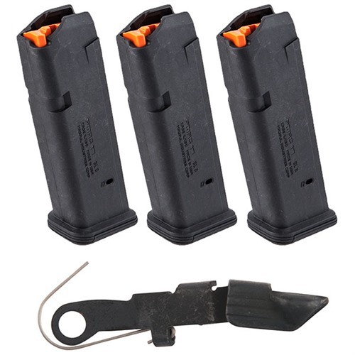 SPECS: Magazine Fits - Glock full-size 9mm handguns, as well as compact and sub-compact variants. Capacity - 17 rounds. Construction - Polymer. Slide Stop: Steel, matte black finish. 3-Pin fits all guns with separate trigger, locking block, and trigger housing pins, including early 2-Pin G19. Does not fit early G17, 17L, and 34 2-Pin guns. 2-Pin fits G17, 17L, and 34 that do not have a locking block pin, manufactured from 1986 to mid-2002.