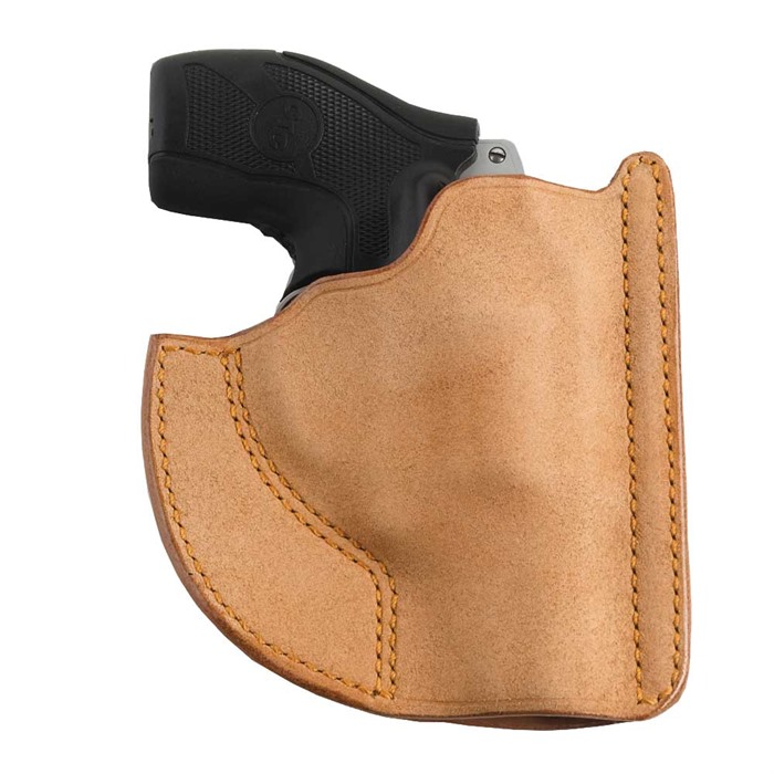 While limiting the carrier to a relatively small handgun, pocket carry offers some unique advantages. Not only is the handgun completely covered and concealed, but the gun carrier can casually place a hand on the holstered/pocketed pistol if a nonspecific threat materializes – and the fastest draw is to have the gun already in hand. This premium horsehide pocket holster is designed for front pocket carry in pants or a jacket. It keeps the firearm in the same general position so you can quickly locate the grip when you need to draw. It also conceals the shape of the gun so that its outline is not printed through the pants. Lastly, it allows one-handed release of gun from both pocket and holster. The holster accomplishes this by hooking and catching one of two leather hooks on the top of the holster into your pocket corner when you draw your firearm. With practice (using an unloaded firearm) you can draw the firearm while the holster remains in your pocket or falls away (in the proper pants). It's made with smooth leather inside against the gun for easy release and the rough side out against the pocket, for retention of holster in the pocket. The Front Pocket Horsehide Holster is ambidextrous and available in natural finish. The holster should always be removed from the pocket when holstering the handgun.