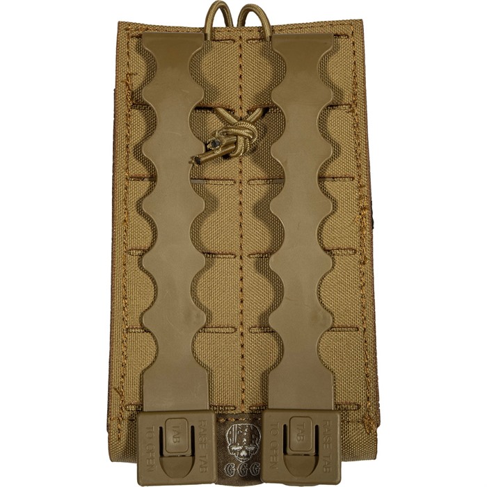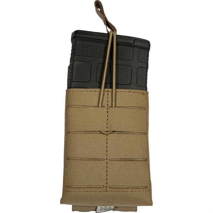 Ce pouch présente un design ouvert avec une sangle de rétention élastique ajustable, permettant un retrait silencieux de ton chargeur. Il dispose également de sangles modulaires à l'avant et à l'arrière pour empiler d'autres pouches.