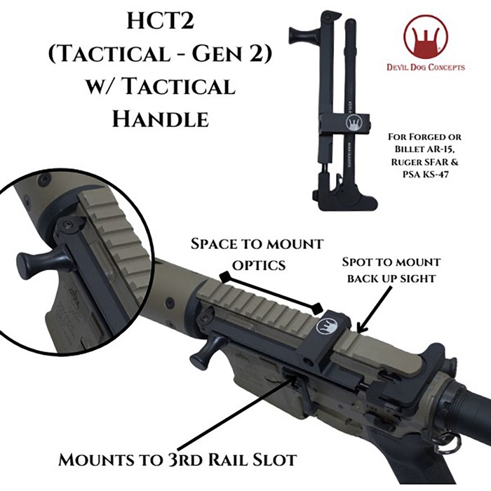 DEVIL DOG CONCPETS HCT2 G2 HARD CHARGER TACTICAL SIDE-CHARGING HANDLE W/TACTICAL PULL HANDLE FOR AR-15 HCT2 (Hard Charger® Tactical – Gen 2) with Tactical Handle: for AR-15 Forged/Billet, SFAR & KS-47 No longer do you have to rebuild your upper receiver or buy a new rifle to have the side charging capability!! Turn your rifle in to a Side Charger without having to rebuild or modify it. Simply swap out the charging handle and install the Hard Charger. Takes a minute or less and you are up and running! FEATURES Devil Dog Concepts’ Side Charging Handle System = Ergonomically Beneficial Multiple Ways to Charge Interchangeable from Rifle to Rifle Non Reciprocating Removes Stress on Roll Pin Reduces Torque on Charging Handle Field Strippable – Gross Motor Skills Plenty of Room for Mounting Optics and Sights The HCT2 (Hard Charger® Tactical Gen 2) Mounts to the 3rd Picatinny Rail. This new model is designed to work on Standard, Forged, Mil-Spec Type Upper Receivers & Billet Rifles. Will also work on Ruger SFAR & PSA KS-47 This design mounts between a Back Up Sight and a forward mounted Optic. The adjustable tip allows for mounting on varying width Billet Receivers as well as the Ruger SFAR and PSA KS-47. SPECS For Forged & Billet AR-15s, and also Ruger SFAR & PSA KS-47 Made from 7075 Aluminum Anodized Black, and Steel Weighs 6oz